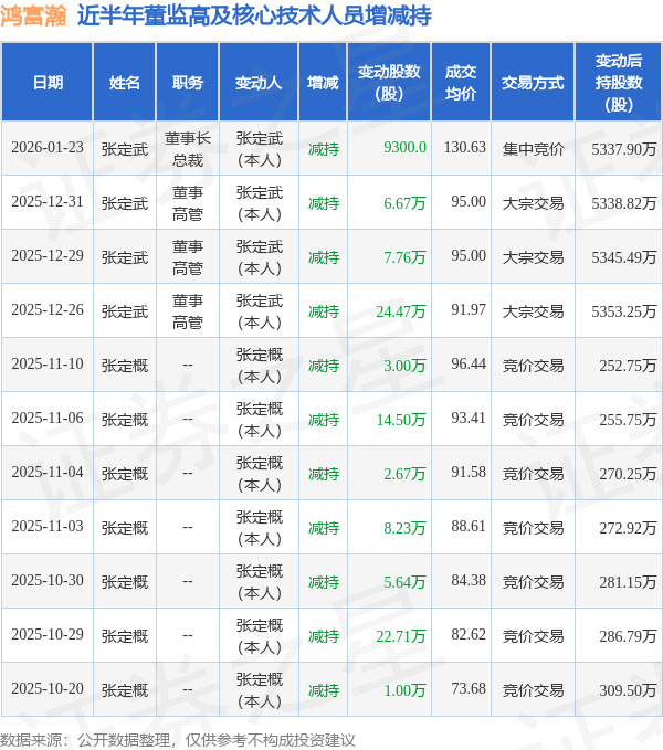 鸿富瀚近半年内的董监高及核心技术人员增减持详情如下: