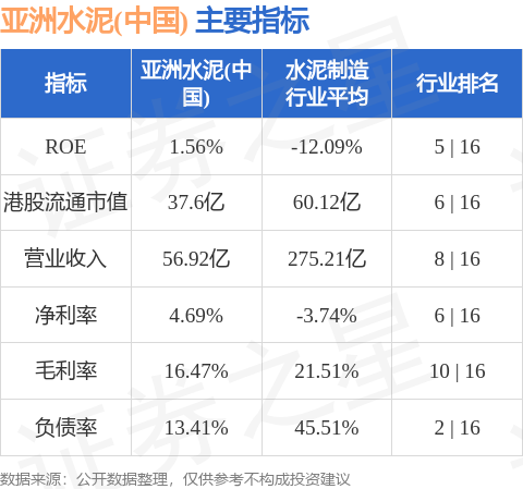 亚洲水泥(中国)港股市值37.6亿港元,在水泥制造行业中排名第6。主要指标见下表: