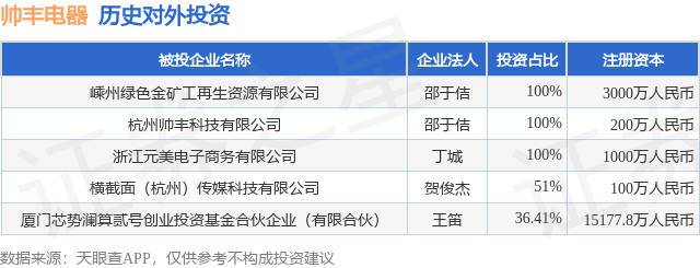 证券之星消息,根据天眼查APP显示,帅丰电器(605336.SH)新增一起对外投资事件,被投资公司为厦门芯势澜算贰号创业投资基金合伙企业(有限合伙),法定代表人王笛,投资占比为36.41%。该公司从事资本市场服务,注册资本为15177.8万人民币。目前,帅丰电器共存在对外投资5项,详见下表: