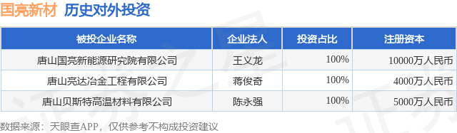 证券之星消息,根据天眼查APP显示,国亮新材(920076.BJ)新增一起对外投资事件,被投资公司为唐山国亮新能源研究院有限公司,法定代表人王义龙,投资占比为100%。该公司从事科技推广和应用服务业,注册资本为10000万人民币。目前,国亮新材共存在对外投资3项,详见下表: