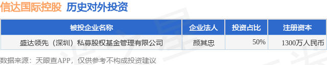 证券之星消息,根据天眼查APP显示,信达国际控股(00111.HK)新增一起对外投资事件,被投资公司为盛达领先(深圳)私募股权基金管理有限公司,法定代表人颜其忠,投资占比为50%。该公司从事资本市场服务,注册资本为1300万人民币。目前,信达国际控股共存在对外投资1项,详见下表: