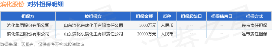 滨化股份1月23日披露2笔对外担保,被担保方为山东滨化东瑞化工有限责任公司。对外担保明细如下表: