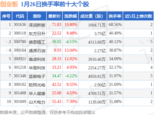 当日创业板换手率前10大个股中8只个股收涨,平均涨幅9.84%,其中泽润新能(301636)以换手率68.56%排第一,6只个股近5个交易日中多次上榜。