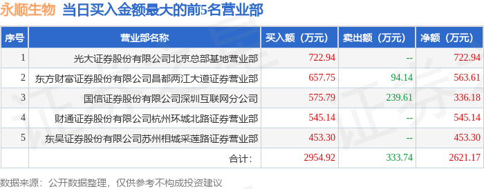 证券之星消息,沪深交易所2026年1月26日公布的交易公开信息显示,永顺生物(920729)因当日换手率达到20%的前5只股票,当日价格振幅达到30%的前5只股票,当日收盘价涨幅达到20%的前5只股票登上龙虎榜。此次是近5个交易日内第1次上榜。