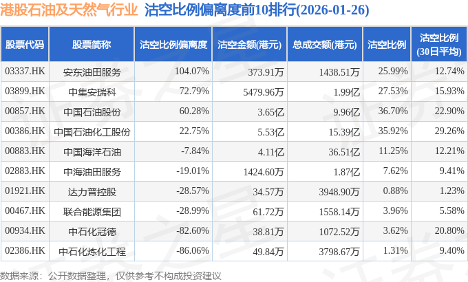 从沽空比例偏离度来看,安东油田服务、中集安瑞科、中国石油股份沽空比例偏离度位居行业前三,分别为104.07%、72.79%、60.28%。
