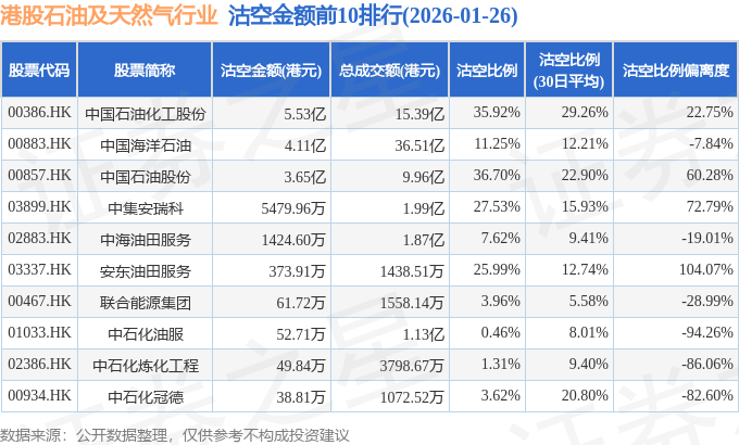 从沽空金额来看,中国石油化工股份、中国海洋石油、中国石油股份沽空金额位居行业前三,分别为5.53亿港元、4.11亿港元、3.65亿港元。