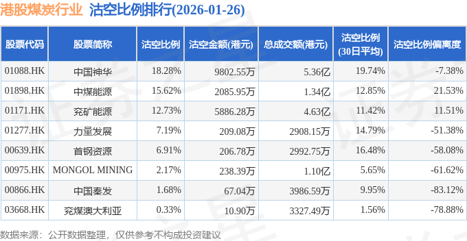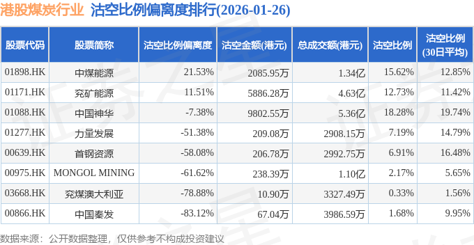 从沽空比例偏离度来看,中煤能源、兖矿能源、中国神华沽空比例偏离度位居行业前三,分别为21.53%、11.51%、-7.38%。