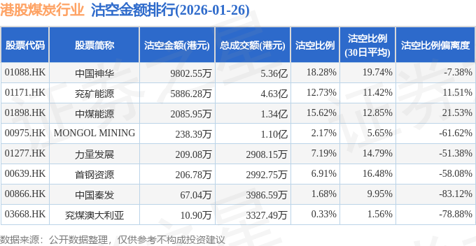 从沽空金额来看,中国神华、兖矿能源、中煤能源沽空金额位居行业前三,分别为9802.55万港元、5886.28万港元、2085.95万港元。