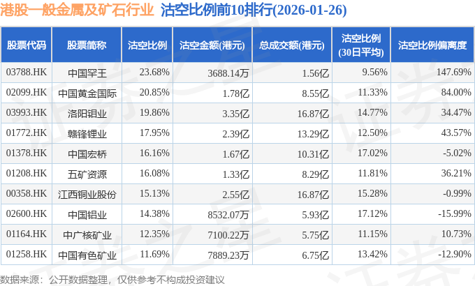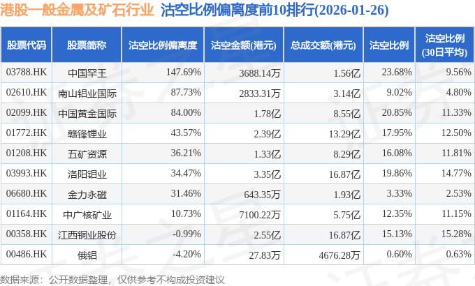 从沽空比例偏离度来看,中国罕王、南山铝业国际、中国黄金国际沽空比例偏离度位居行业前三,分别为147.69%、87.73%、84%。
