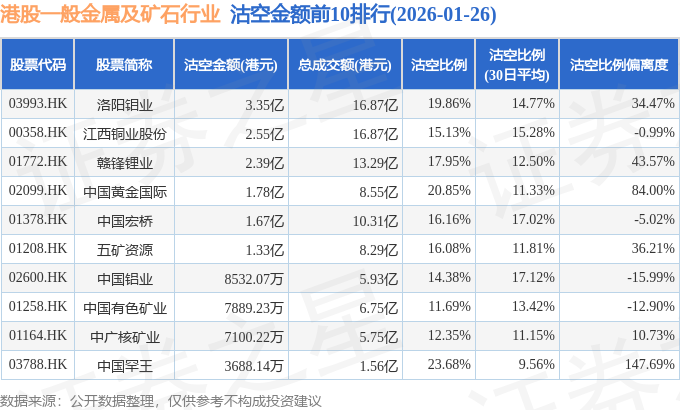 从沽空金额来看,洛阳钼业、江西铜业股份、赣锋锂业沽空金额位居行业前三,分别为3.35亿港元、2.55亿港元、2.39亿港元。