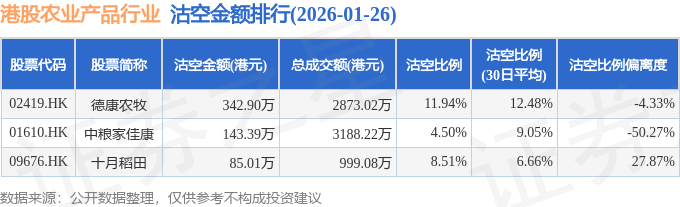 证券之星消息,1月26日港交所披露数据显示,当日港股农业产品行业的21只个股中有3只被沽空,总沽空股数为103.03万股,总沽空金额为571.29万元(港元),而当日农业产品行业的总成交金额为7712.9万元(港元),沽空比例为7.41%。当日农业产品行业总体涨0.9%。