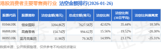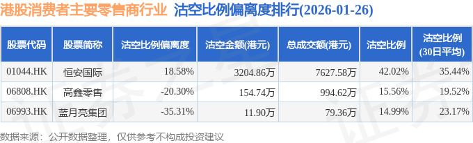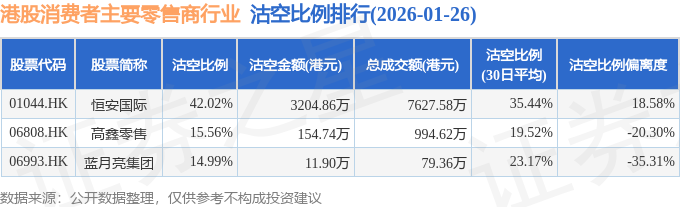 由于港股人民币柜台交易股票成交金额较小,沽空比例普遍偏高,为了避免干扰,已将人民币柜台交易股票从排行表格中剔除。