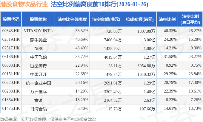 从沽空比例偏离度来看,VITASOY INT'L、蒙牛乳业、锅圈沽空比例偏离度位居行业前三,分别为53.52%、48.69%、43.49%。