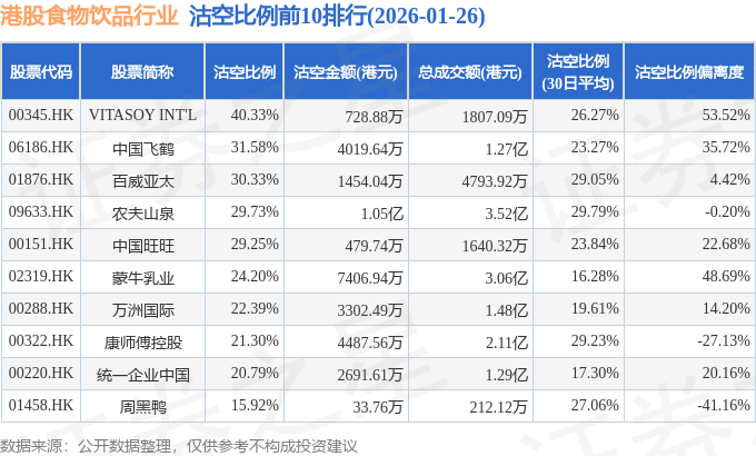 从沽空比例来看,VITASOY INT'L、中国飞鹤、百威亚太沽空比例位居行业前三,分别为40.33%、31.58%、30.33%。