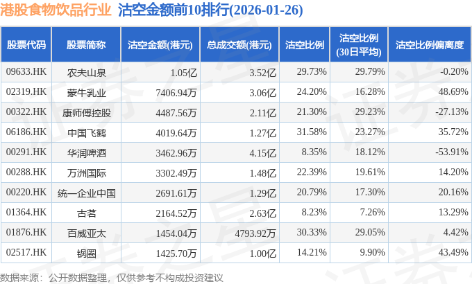 从沽空金额来看,农夫山泉、蒙牛乳业、康师傅控股沽空金额位居行业前三,分别为1.05亿港元、7406.94万港元、4487.56万港元。