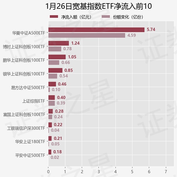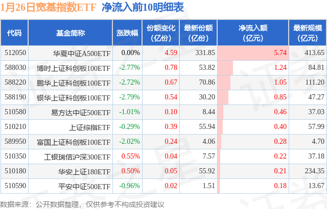 当日有56只宽基指数ETF基金出现资金净流入,其中净流入排首位的是华夏中证A500ETF(512050),份额增加了4.59亿份,净流入额为5.74亿元。