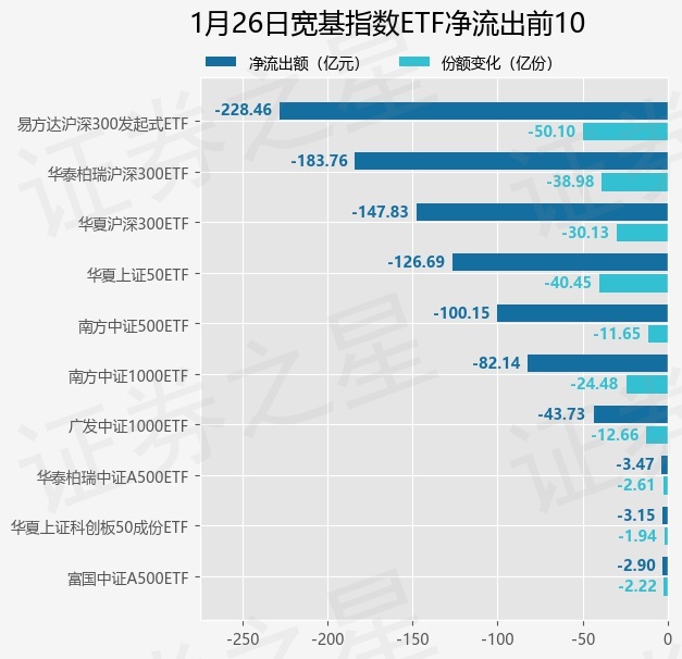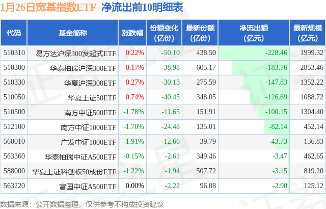 当日有45只宽基指数ETF基金出现资金净流出,其中净流出排首位的是易方达沪深300发起式ETF(510310),份额减少了50.1亿份,净流出额为228.46亿元。