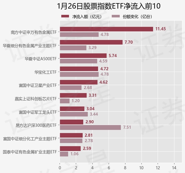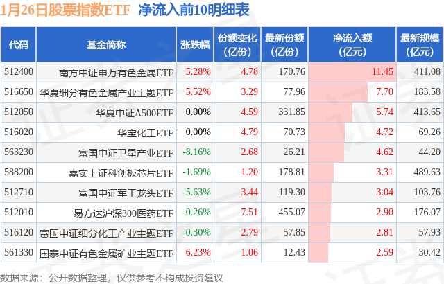 当日有251只股票指数ETF基金出现资金净流入,其中净流入排首位的是南方中证申万有色金属ETF(512400),份额增加了4.78亿份,净流入额为11.45亿元。