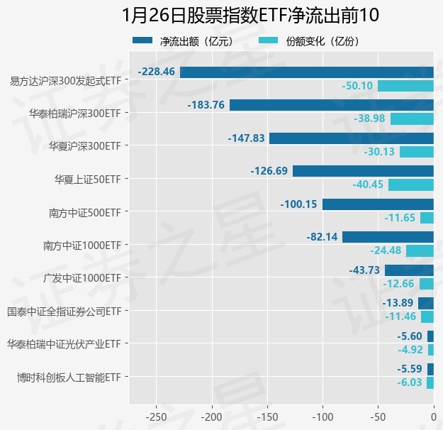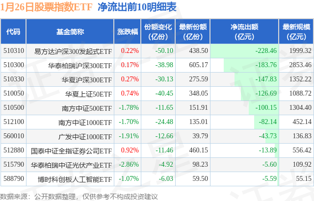 当日有195只股票指数ETF基金出现资金净流出,其中净流出排首位的是易方达沪深300发起式ETF(510310),份额减少了50.1亿份,净流出额为228.46亿元。