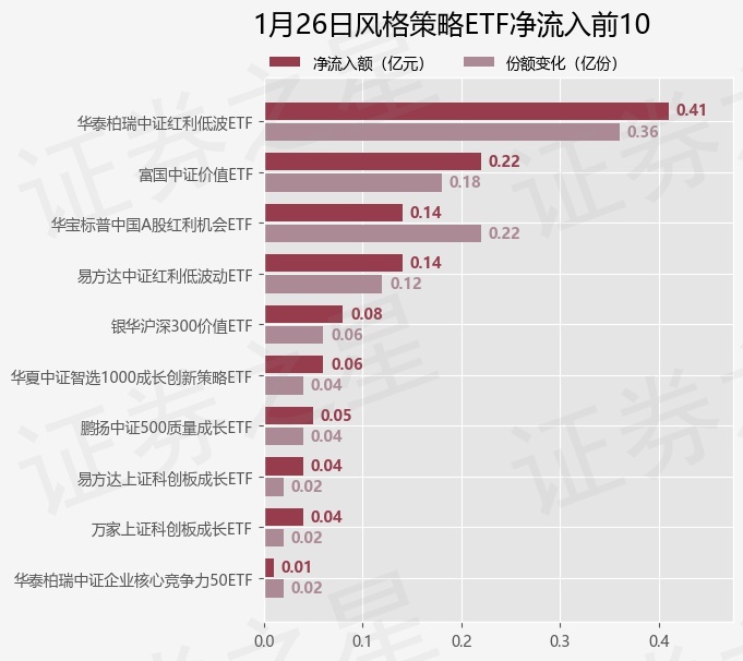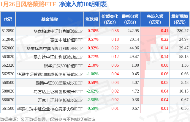 当日有11只风格策略ETF基金出现资金净流入,其中净流入排首位的是华泰柏瑞中证红利低波ETF(512890),份额增加了3600.0万份,净流入额为4147.6万元。