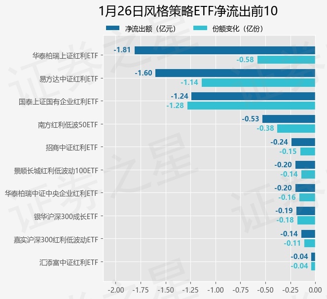 当日有18只风格策略ETF基金出现资金净流出,其中净流出排首位的是华泰柏瑞上证红利ETF(510880),份额减少了5850.0万份,净流出额为1.81亿元。