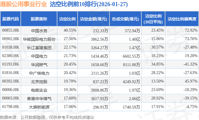从沽空比例偏离度来看,华能国际电力股份、中国水务、华电国际电力股份沽空比例偏离度位居行业前三,分别为73.76%、72.92%、68.01%。