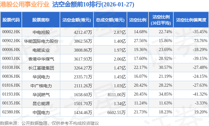 从沽空金额来看,中电控股、华能国际电力股份、电能实业沽空金额位居行业前三,分别为4212.47万港元、3862.56万港元、3808.86万港元。