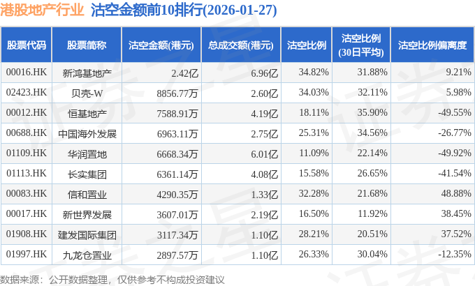 从沽空金额来看,新鸿基地产、贝壳-W、恒基地产沽空金额位居行业前三,分别为2.42亿港元、8856.77万港元、7588.91万港元。