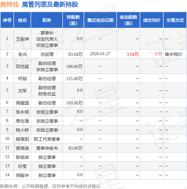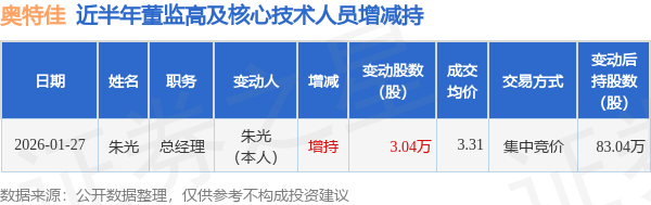 奥特佳近半年内的董监高及核心技术人员增减持详情如下: