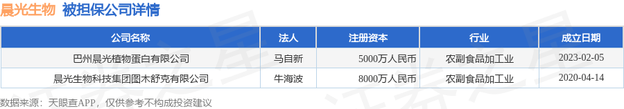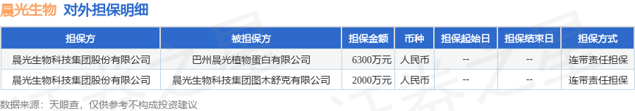晨光生物1月25日披露2笔对外担保,被担保公司2家。对外担保明细如下表:
