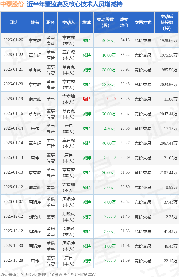 中泰股份近半年内的董监高及核心技术人员增减持详情如下:
