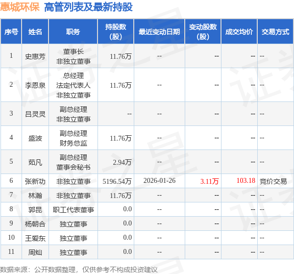 惠城环保近半年内的董监高及核心技术人员增减持详情如下: