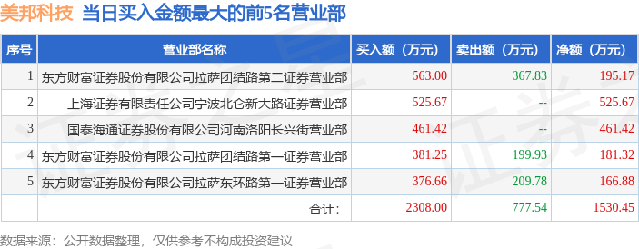 证券之星消息,沪深交易所2026年1月28日公布的交易公开信息显示,美邦科技(920471)因当日换手率达到20%的前5只股票登上龙虎榜。此次是近5个交易日内第2次上榜。
