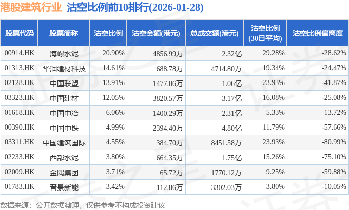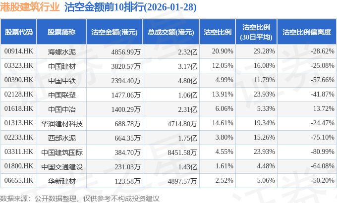 从沽空金额来看,海螺水泥、中国建材、中国中铁沽空金额位居行业前三,分别为4856.99万港元、3820.57万港元、2394.4万港元。