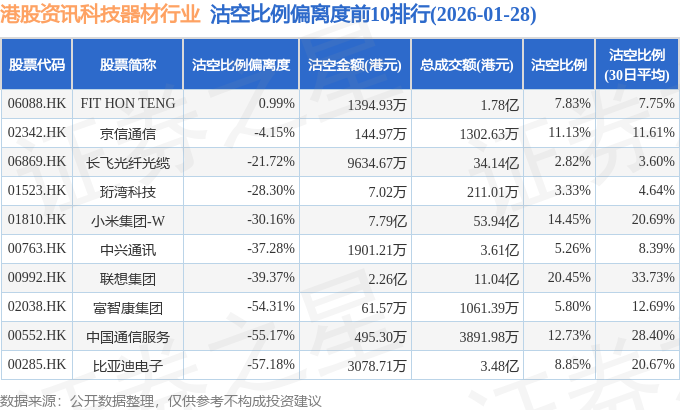 从沽空比例偏离度来看,FIT HON TENG、京信通信、长飞光纤光缆沽空比例偏离度位居行业前三,分别为0.99%、-4.15%、-21.72%。