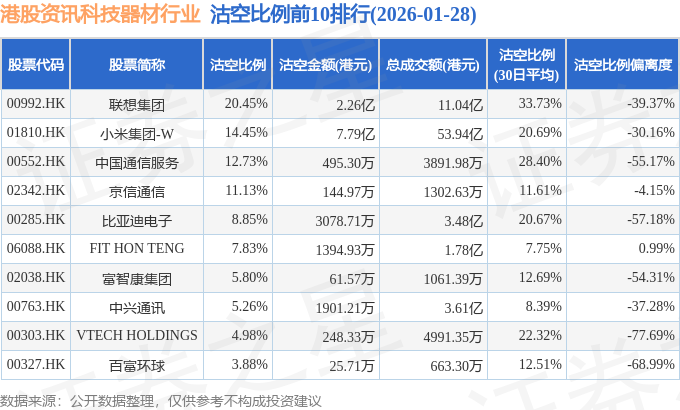 从沽空比例来看,联想集团、小米集团-W、中国通信服务沽空比例位居行业前三,分别为20.45%、14.45%、12.73%。