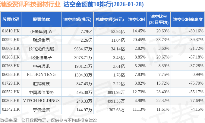 从沽空金额来看,小米集团-W、联想集团、长飞光纤光缆沽空金额位居行业前三,分别为7.79亿港元、2.26亿港元、9634.67万港元。