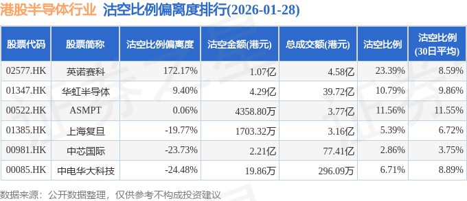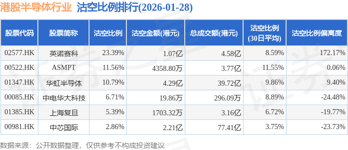 从沽空比例来看,英诺赛科、ASMPT、华虹半导体沽空比例位居行业前三,分别为23.39%、11.56%、10.79%。