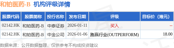 投行对该股的评级以跑赢行业(OUTPERFORM)为主,近90天内共有1家投行给出跑赢行业(OUTPERFORM)评级,近90天的目标均价为18港元。中泰证券最新一份研报给予和铂医药-B买入评级。