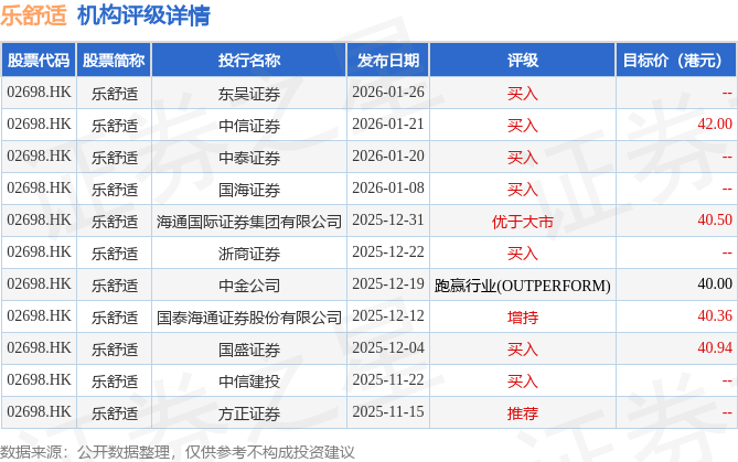投行对该股的评级以买入为主,近90天内共有7家投行给出买入评级,近90天的目标均价为40.76港元。东吴证券最新一份研报给予乐舒适买入评级。