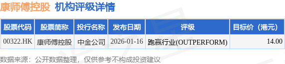 高盛发布研报称,看好康师傅(00322.HK)较专注于发展即食面业务,今年市场份额及经营效率有望提升,预期该公司今年经营前景向好,将2025至2027年盈利预测上调5%至8%,预测即食面业务经营利润率将受惠于成本压力缓和、产品提价及费用节省而有所扩张,将目标价从12.7港元升至13.7港元,重申“买入”评级。