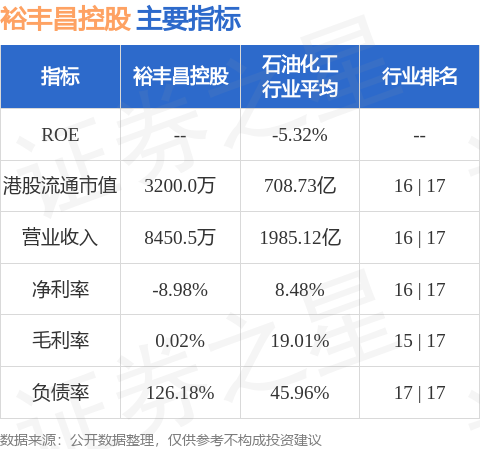 裕丰昌控股港股市值3200万港元,在石油化工行业中排名第16。主要指标见下表: