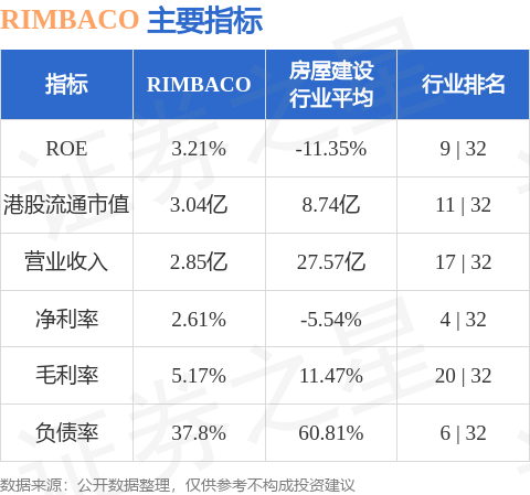 RIMBACO港股市值3.04亿港元,在房屋建设行业中排名第11。主要指标见下表: