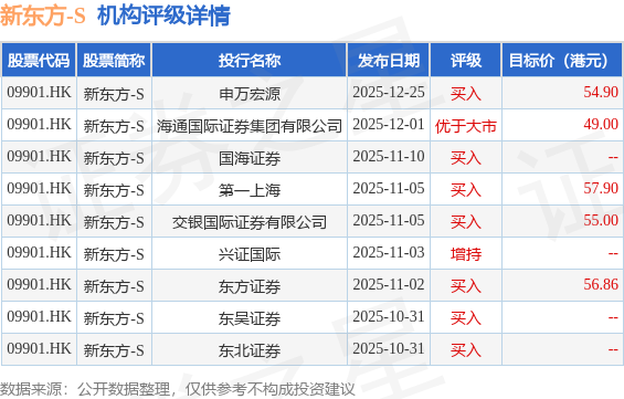 投行对该股的评级以买入为主,近90天内共有7家投行给出买入评级,近90天的目标均价为54.73港元。申万宏源最新一份研报给予新东方-S买入评级,目标价54.9港元。