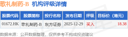投行对该股的评级以买入为主,近90天内共有1家投行给出买入评级,近90天的目标均价为18.38港元。东方证券最新一份研报给予歌礼制药-B买入评级,目标价18.38港元。