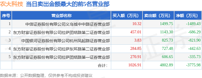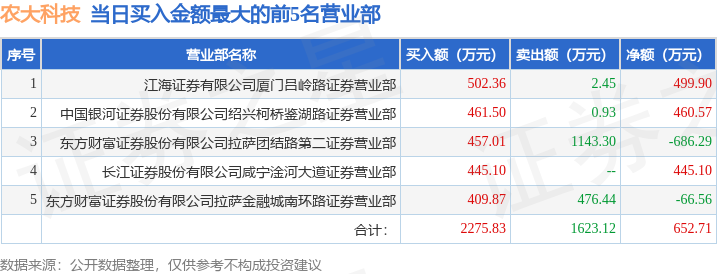 证券之星消息,沪深交易所2026年1月29日公布的交易公开信息显示,农大科技(920159)因当日换手率达到20%的前5只股票登上龙虎榜。此次是近5个交易日内第1次上榜。