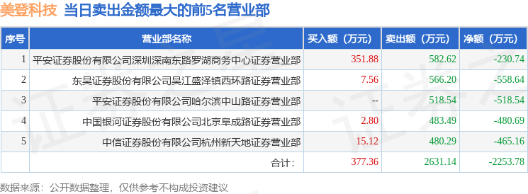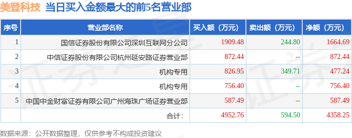 证券之星消息,沪深交易所2026年1月29日公布的交易公开信息显示,美登科技(920227)因当日换手率达到20%的前5只股票登上龙虎榜。此次是近5个交易日内第1次上榜。