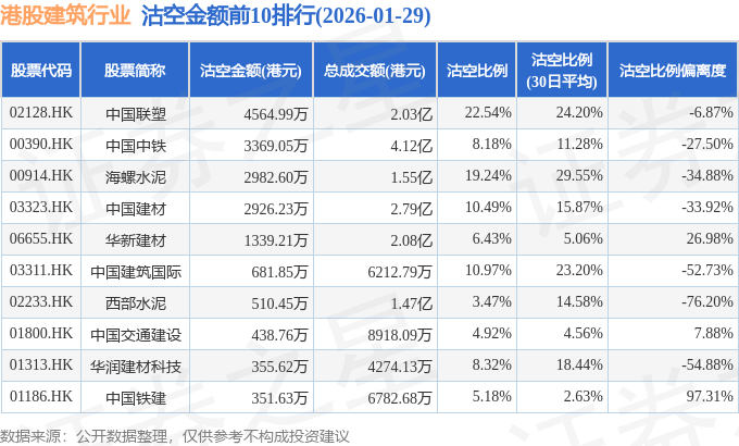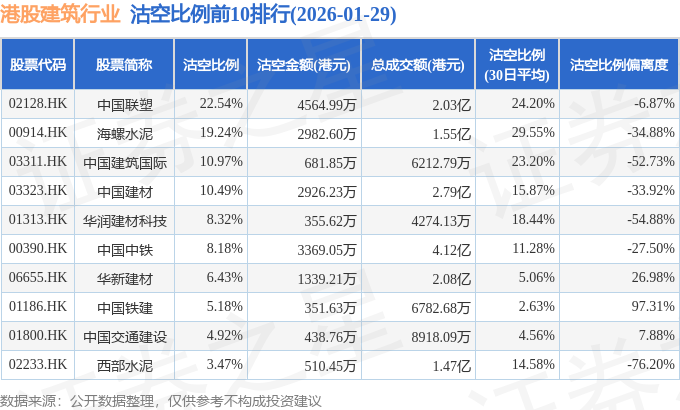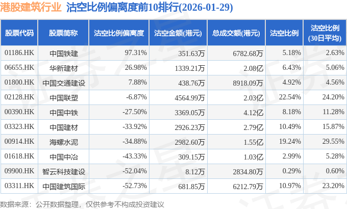 从沽空比例偏离度来看,中国铁建、华新建材、中国交通建设沽空比例偏离度位居行业前三,分别为97.31%、26.98%、7.88%。
