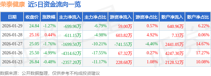 证券之星消息,截至2026年1月29日收盘,荣泰健康(603579)报收于24.84元,下跌1.27%,换手率2.03%,成交量4.12万手,成交额1.03亿元。