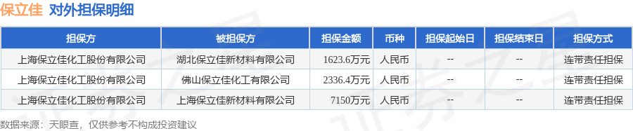保立佳1月29日披露3笔对外担保,被担保公司3家。对外担保明细如下表: